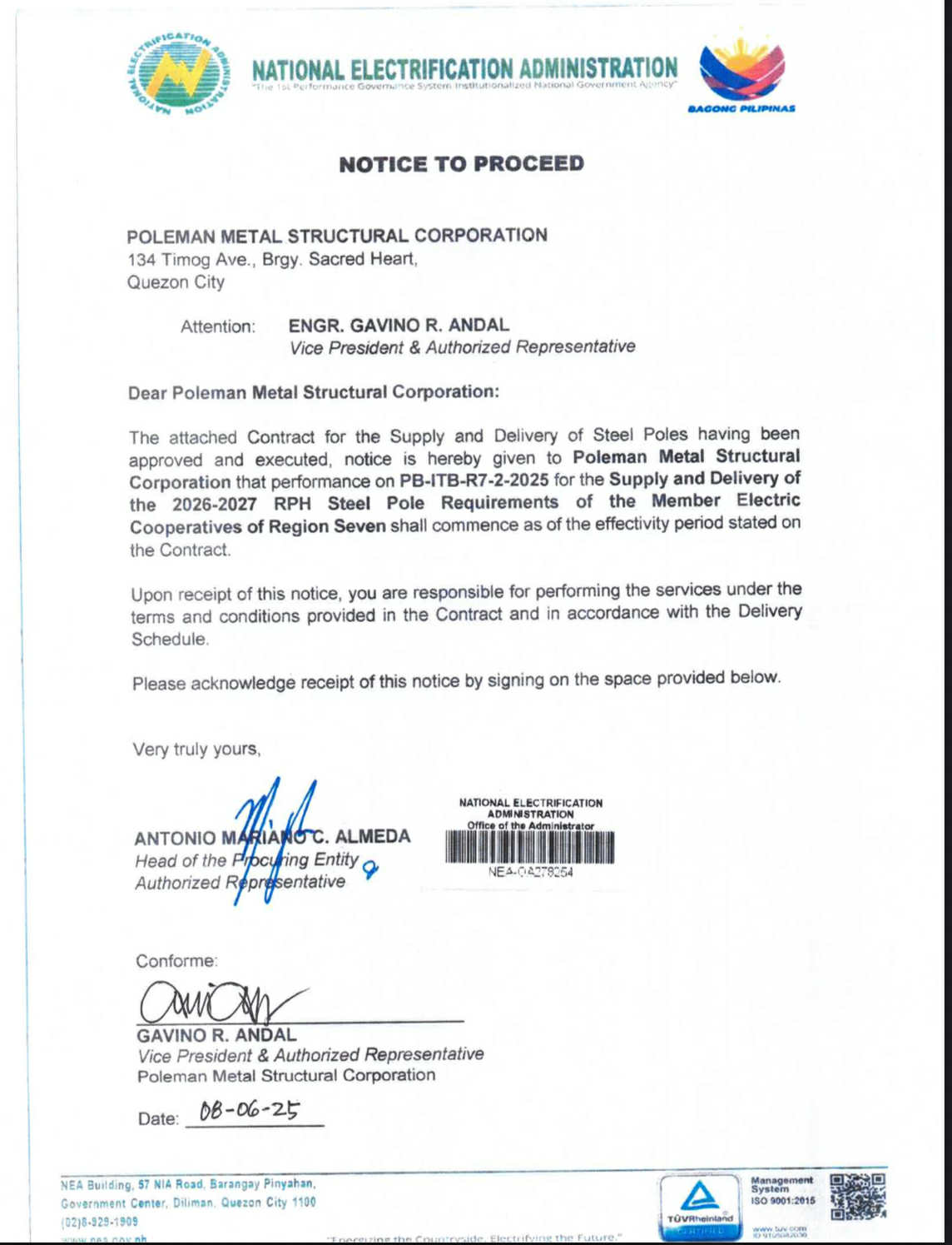 Notice to Proceed PB-ITB-R7-2-2025 for the Supply of Delivery of the 2026-2027 Steel Pole